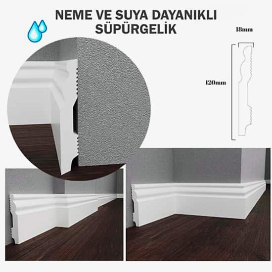 12 cm Polimer Lake Süpürgelik suya rutubete dayanıklı malzemeden üretilmiştir. Şişmez, çürümez ve böceklenmez. Profilin yüzeyi kalkmaz, kabarmaz ve solmaz. Bakteri barındırmaz.