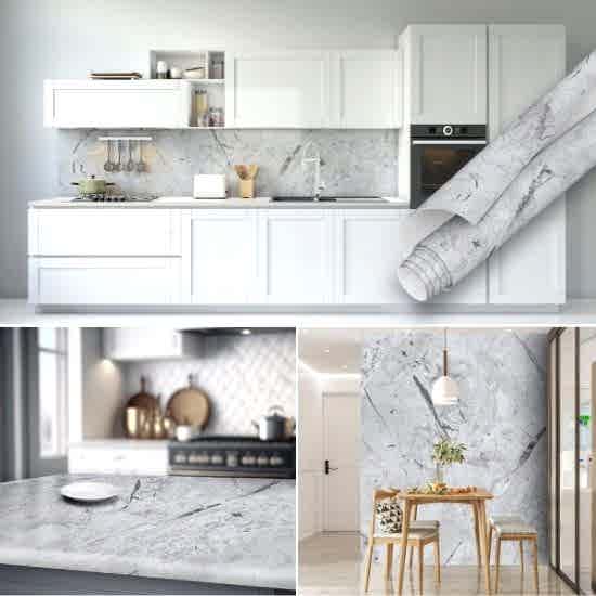 Açık Gri Mermer Desenli Yapışkanlı Folyo ile Mutfak Tezgah Arası Kaplama