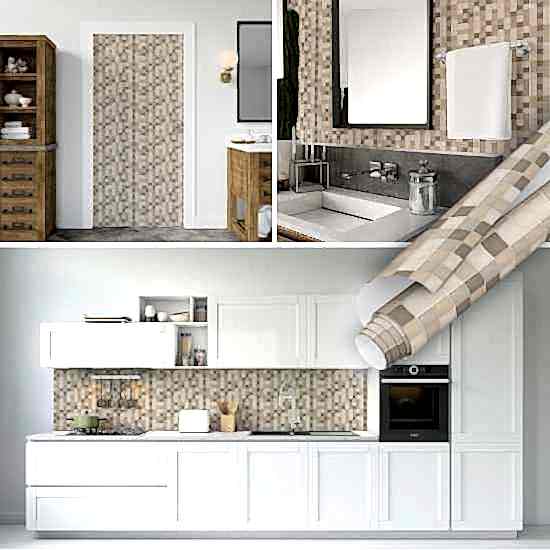 Kahve tonlarda mozaik desenli, fayans görünümlü yapışkanlı folyo modelleri ile evinizin havasını değiştirin. Üstelik mozaik desenli folyolar en çok tercih edilen yapışkan folyo modelidir.