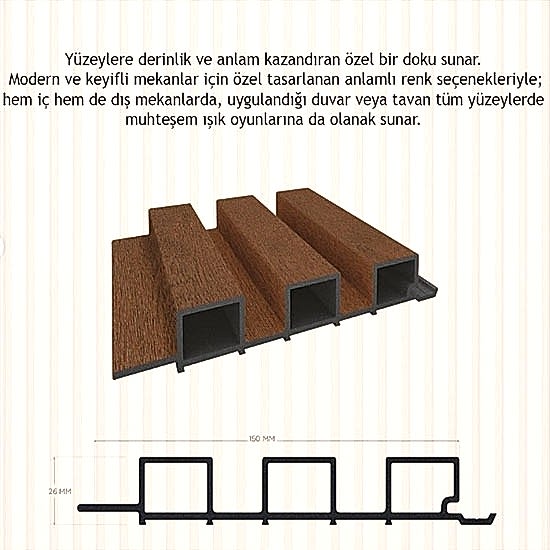 - Dış mekan lambri 3200 mm boyunda, 150 mm enindedir. 26 mm kalınlığındadır. 1 boyu yaklaşık 0,48 m2 alan kaplar.