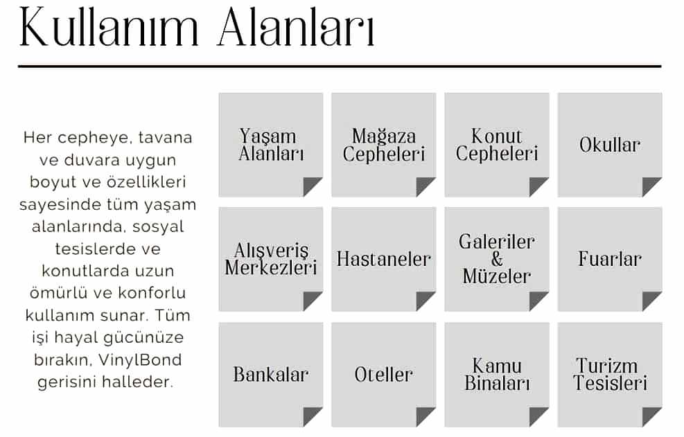 Her cepheye tavana ve duvara uygun boyut ve özellikleri sayesinde tüm yaşam alanlarında kullanılır. Okullarda, kafelerde, bina giydirmelerinde, alışveriş merkezlerinde, hastanelerde, galerilerde, fuarlarda, otel bahçe ve binalarında, kamu binalarında, tüm turizm tesislerinde, plajlarda kullanılır. Konfor ve güzellik katar.