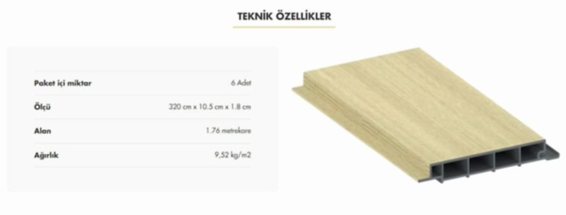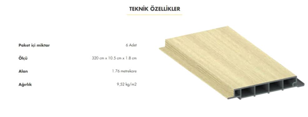 - Dış mekan lambri 3200 mm boyunda, 100 mm enindedir. 18 mm kalınlığındadır. 1 boyu yaklaşık 0,32 m2 alan kaplar.