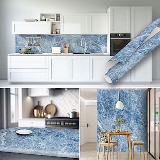 Mavi Mermer Desenli Kendinden Yapışkanlı Folyo ile Mutfak Tezgah Arası Kaplama