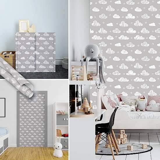 Sevimli gri bulut desenli yapışkanlı çocuk odası kaplama folyo modelleri ile çocuk odasının havasını değiştirin. Üstelik sevimli desenli folyolar en çok tercih edilen çocuk odası yapışkan folyo modelidir.